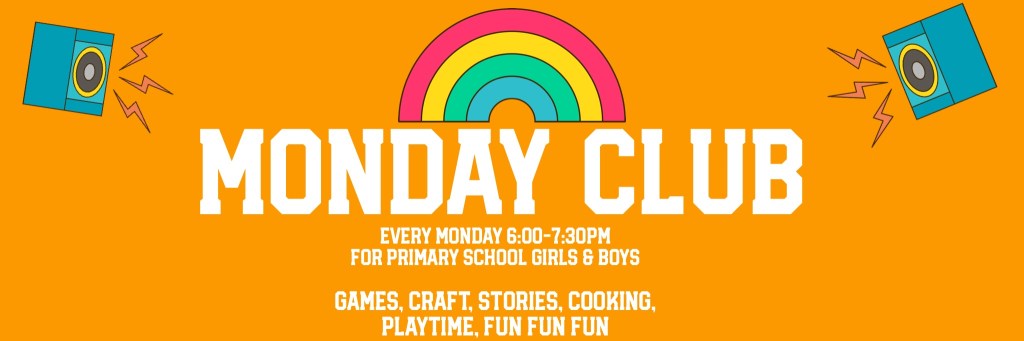 If you have ever been to a holiday kids club you’ll know what Monday club is like. A high energy mix of games, craft, songs, stories and special events. The Monday Club is for boys and girls of Primary School age.