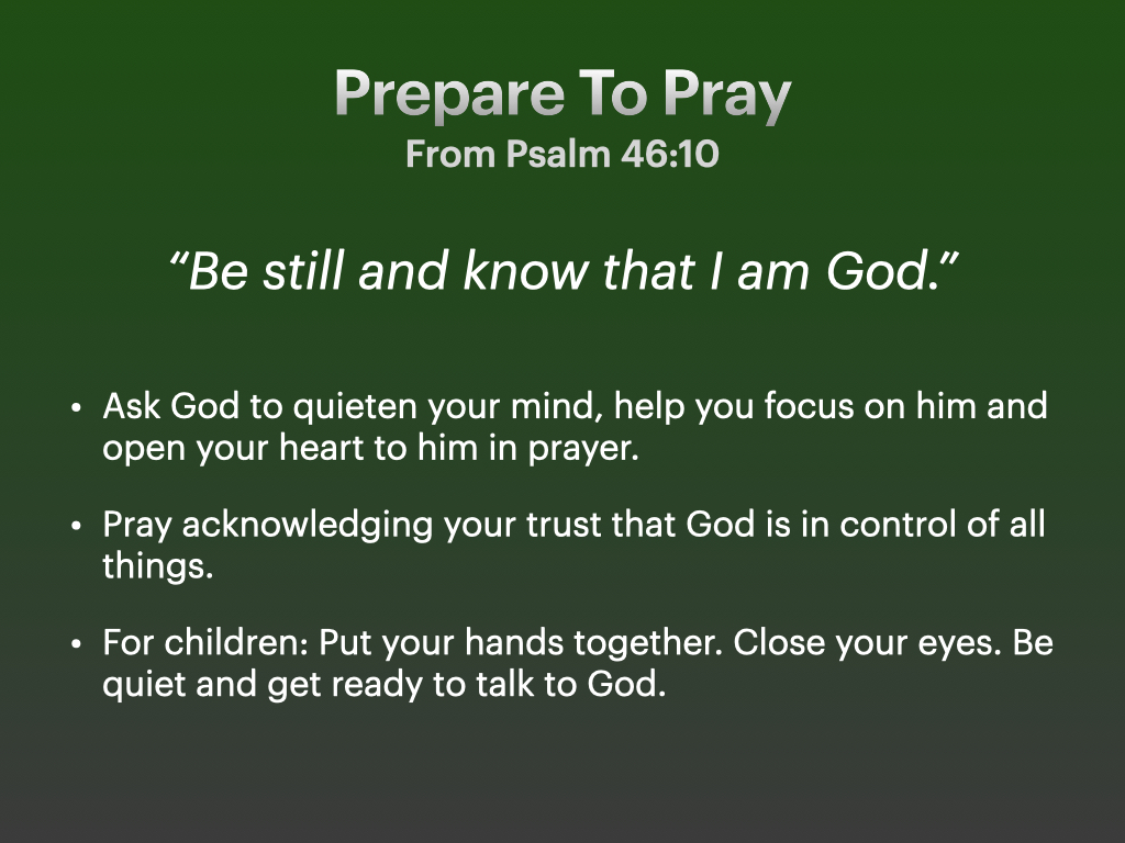 The material that has been prepared is outlined in the picutres below. Take 10 minutes on each of the headings. Preparation, Lord’s Prayer, Praise, Parable, Promise and Parting.